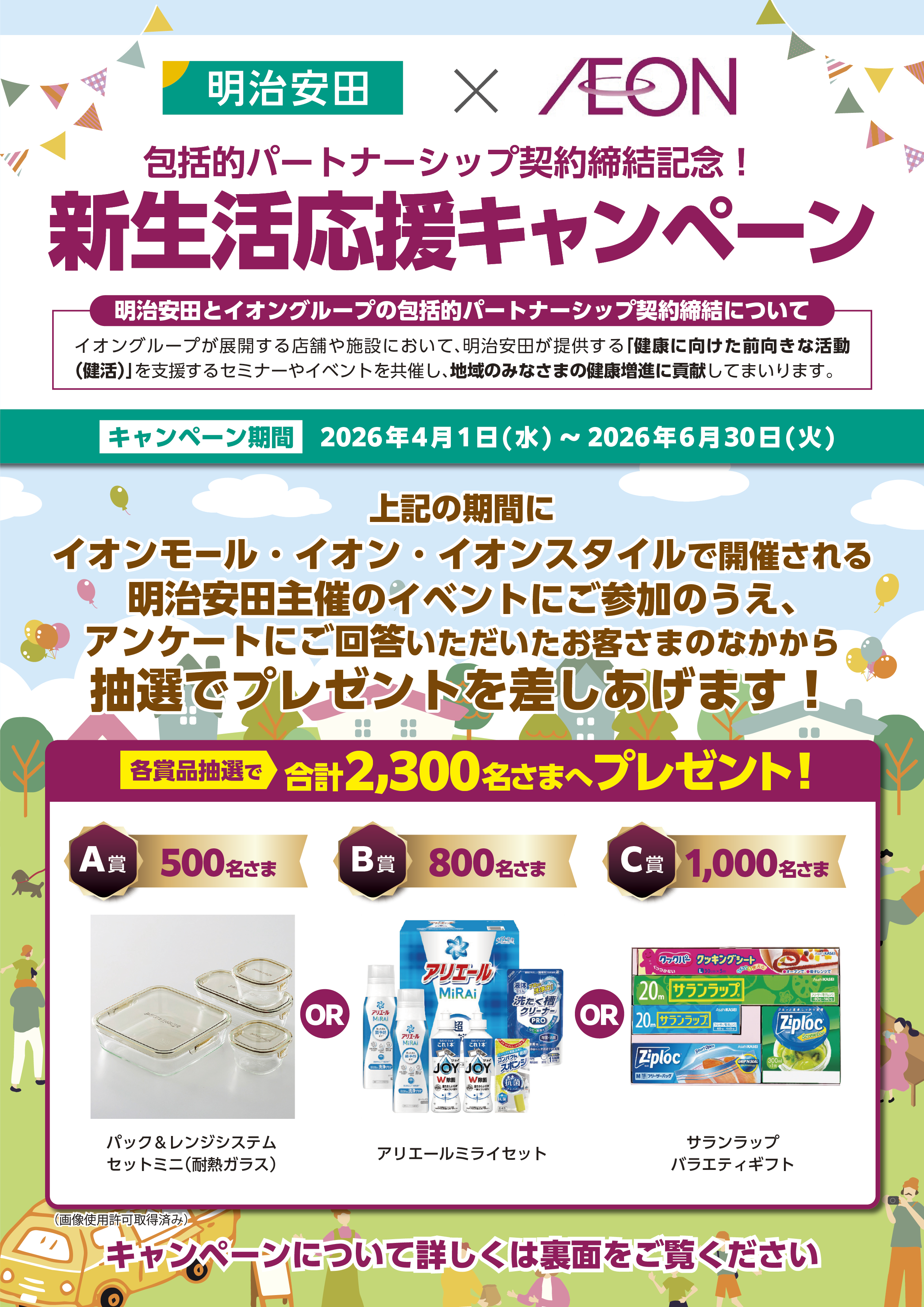キャンペーン期間中に、イオンモール・イオン・イオンスタイルで開催される明治安田主催のイベントにご参加のうえ、簡単なアンケートにお答えいただいたお客さまのなかから抽選で合計2.300名さまに素敵な賞品をプレゼントします!次画面の入力フォームからアンケートにお答えください。