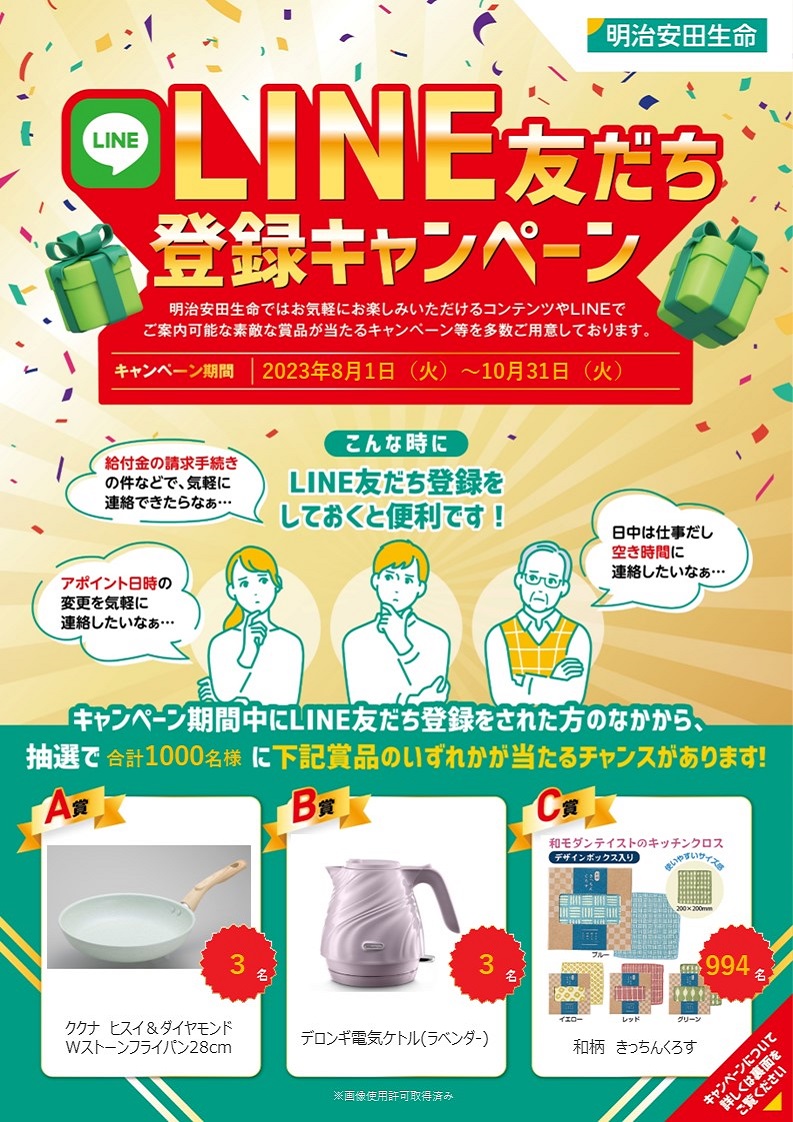 キャンペーン期間中に担当者のLINEアカウントを友だち登録いただき、簡単なアンケートにお答えいただいたお客さまに、抽選で1000名さまに素敵な賞品をプレゼントします!次画面の入力フォームからアンケートにお答えください。