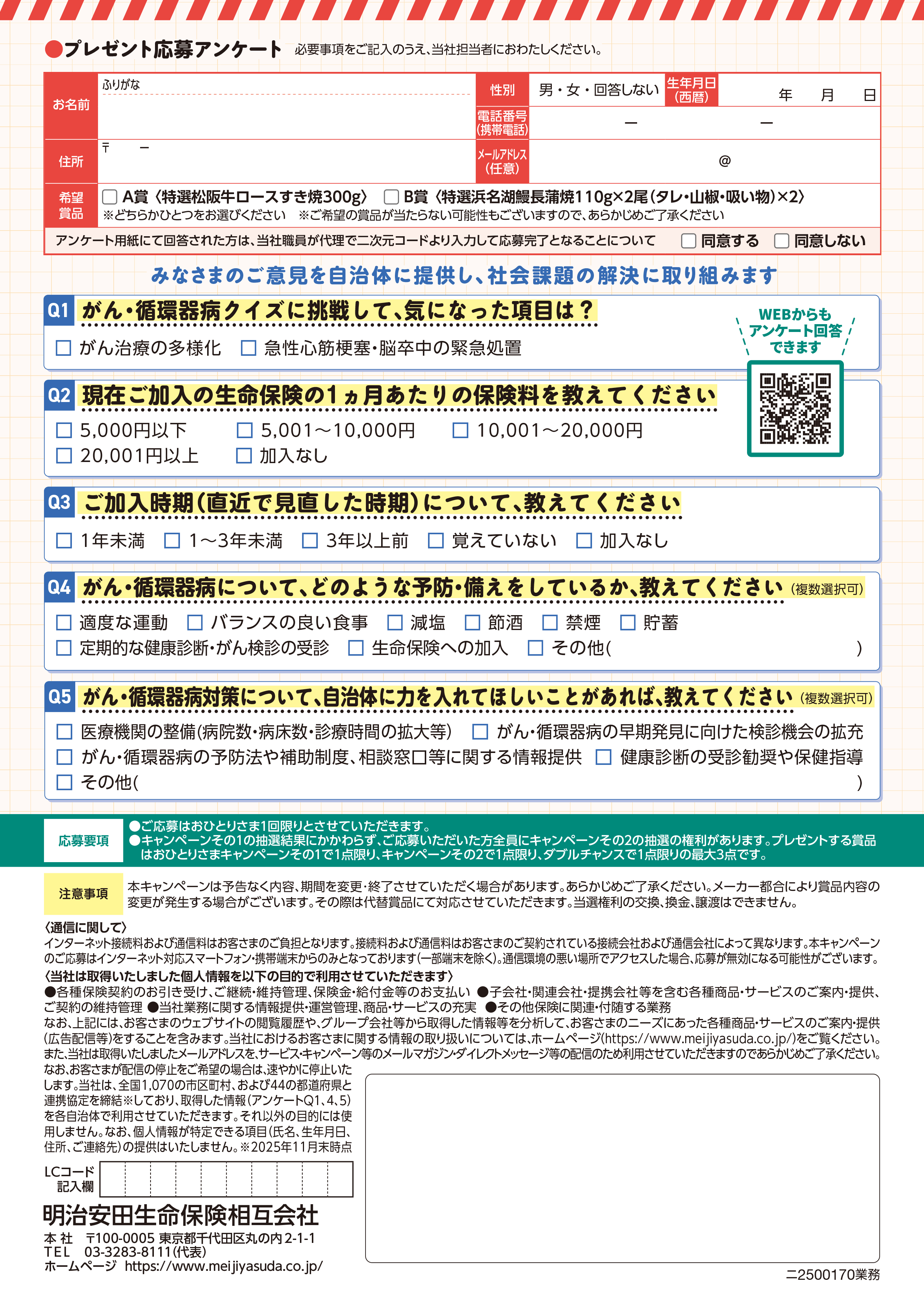 なお、上記には、お客さまのウェブサイトの閲覧履歴や、グループ会社等から取得した情報等を分析して、お客さまのニーズにあった各種商品・サービスのご案内・提供(広告配信等)をすることを含みます。当社におけるお客さまに関する情報の取り扱いについては、ホームページをご覧ください。また、当社は取得いたしましたメールアドレスを、サービス・キャンペーン等のメールマガジン・ダイレクトメッセージ等の配信のため利用させていただきますのであらかじめご了承ください。なお、お客さまが配信の停止をご希望の場合は、速やかに停止いたします。当社は、全国1,070の市区町村、および44の都道府県と連携協定を締結※しており、取得した情報(アンケートQ1、4、5)を各自治体で利用させていただきます。それ以外の目的には使用しません。なお、個人情報が特定できる項目(氏名、生年月日、住所、ご連絡先)の提供はいたしません。