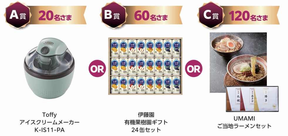 ●賞品はお選びいただけません。賞品の在庫状況によっては、当選賞品が変更となる場合があります。