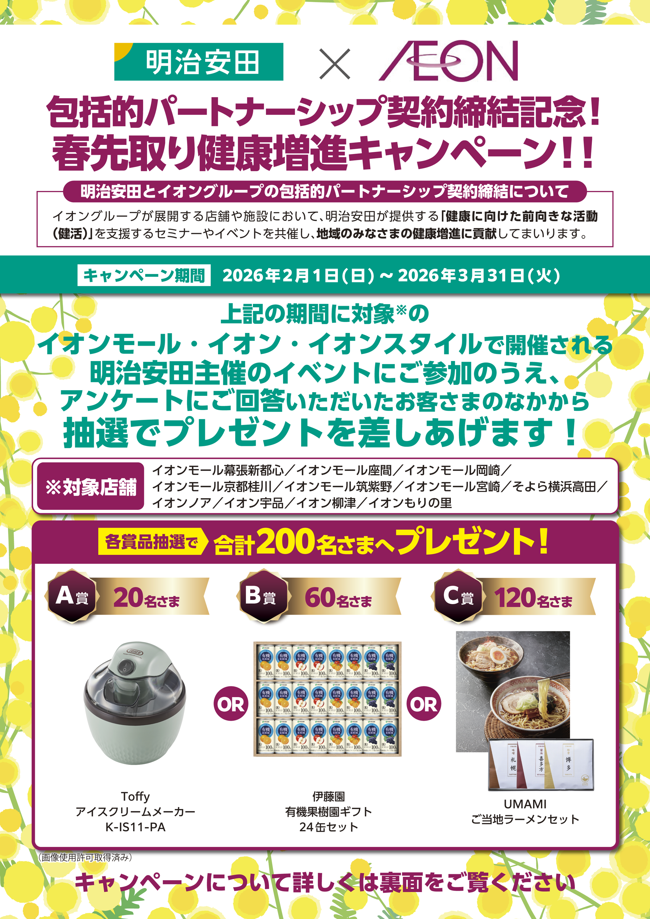 キャンペーン期間中に、対象のイオンモール・イオン・イオンスタイルで開催される明治安田主催のイベントにご参加のうえ、簡単なアンケートにお答えいただいたお客さまのなかから抽選で合計200名さまに素敵な賞品をプレゼントします!次画面の入力フォームからアンケートにお答えください。